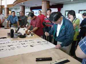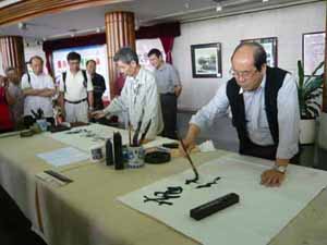 雖 然只有三個星期的時間籌備,17位會友連同親友,一行32人於星期六早上準時出發。為了方便及安全,在香港租了一部49座的冷氣旅遊車,全程接載。皇崗口 岸檢疫嚴謹,三位衛生官員登車,個別量度體溫、檢查填報健康表等,我們精神奕奕,很快通過關口。途中加插了特別節目:馬潤憲副會長講故事,內容令人感慨; 之後,幾位團友興致勃勃地大展歌喉,繞樑三日。抵達廣州瀛州村「在水一方」酒樓,才是早上十一時多。鄉村菜肴另有一番風味:鮮玉米汁、紫芯蕃薯、白烚芋 頭、水煮花生是餐前小吃,跟著的走地雞、炒魚麵、豆腐煲、河石斑、生煎飽等十多碟地道風味菜,津津有味。飽餐一頓後,當地之木雕名家、廣州美術學院教授尹秋生帶領我們參觀瀛州村,首先拜會國畫家曾嶸,參觀了他寬敞雅緻的松風齋,沿著藝術文化村前進,看見小河兩旁,生長了密密的大樹,大樹吊滿了紅紅的果實「蓮霧」,真美!難怪吸引了一些年青的畫家、攝影家寫生及取景。我們就忙著參觀油畫家、國畫家之紫雲堂、德采堂及木雕名家尹秋生和書法篆刻家周樹堅等之工作坊。瀛州村位於廣州大學城旁邊,大學的藝術家遷入一些村屋作為工作室,隨著發展,農地轉型,剩下這條村,逐漸 演變成一條別開生面的藝術村,一些古老的村屋已被拆掉,改建為新穎的樓房,成為藝術家圓夢之鄉。原本在離開前,參觀只有一橋之隔的大學城,可惜小橋未能負 荷我們的旅遊車,唯有待下次。黃昏時趕往佛山,入住金湖酒店,晚餐在酒店貴賓廳。很高興邀請得佛山市書法家李小如、王志敏及羅炳生共膳,前兩位書法家曾經 與本會交流,再見面當然是樂事。飯後各自精彩:逛街、按摩、唱K、夜宵、睡覺......。